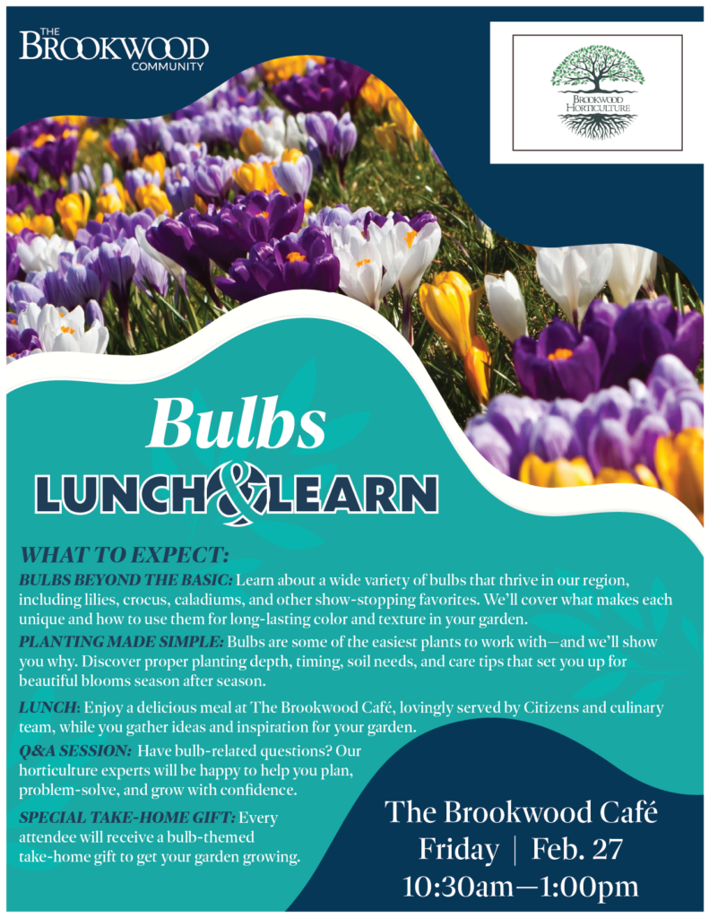 - 🍽️ LUNCH Enjoy a delicious meal at The Brookwood Café, prepared with care by our Citizens and culinary team. It’s the perfect moment to relax, spark your creativity, and connect with fellow garden enthusiasts.