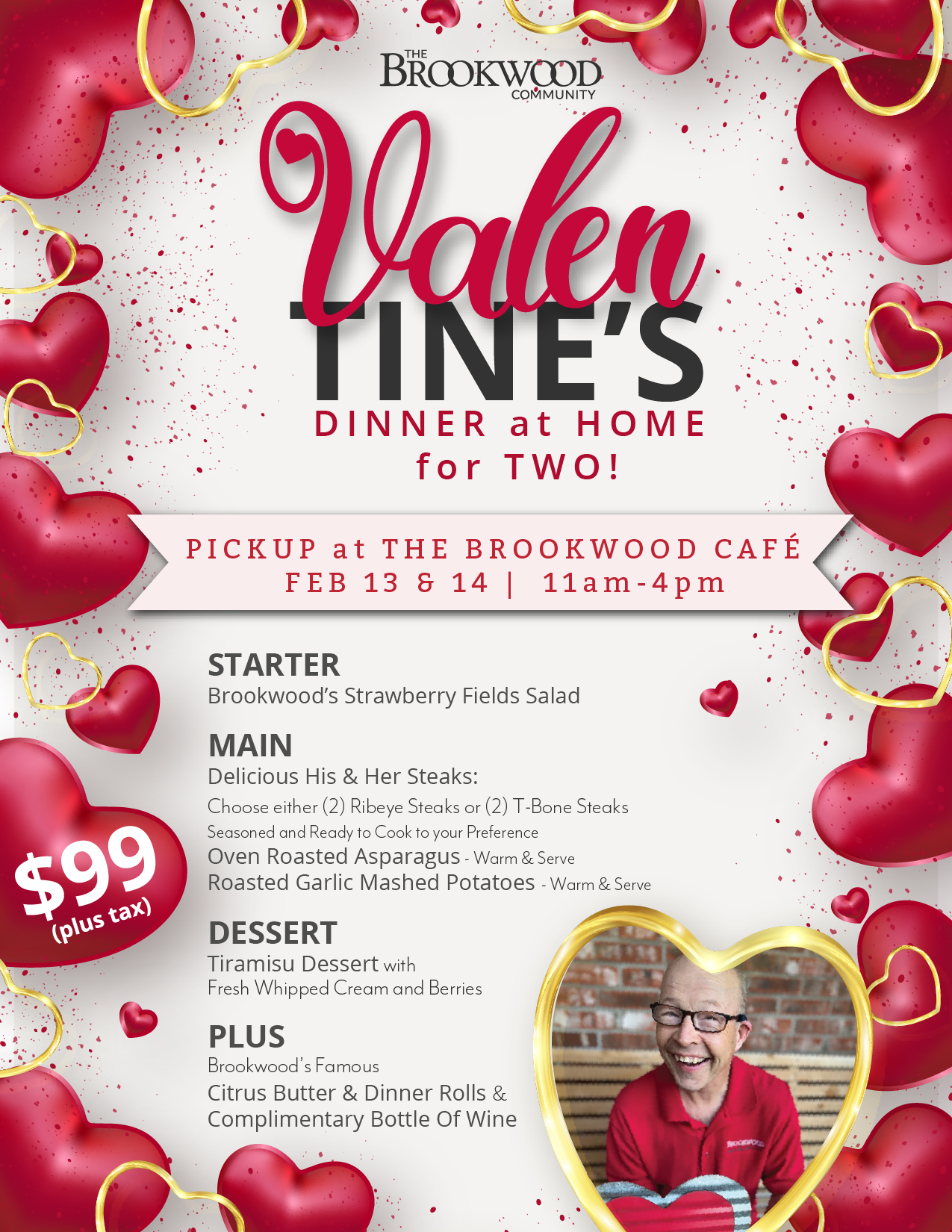 All you need is love…and an oven for our scratch-made menu that is started in our Brookwood kitchens, ready to be finished in yours with simple, step-by-step reheating and cooking instructions. There are only 30 Valentine Dinners available for purchase – so order yours today!