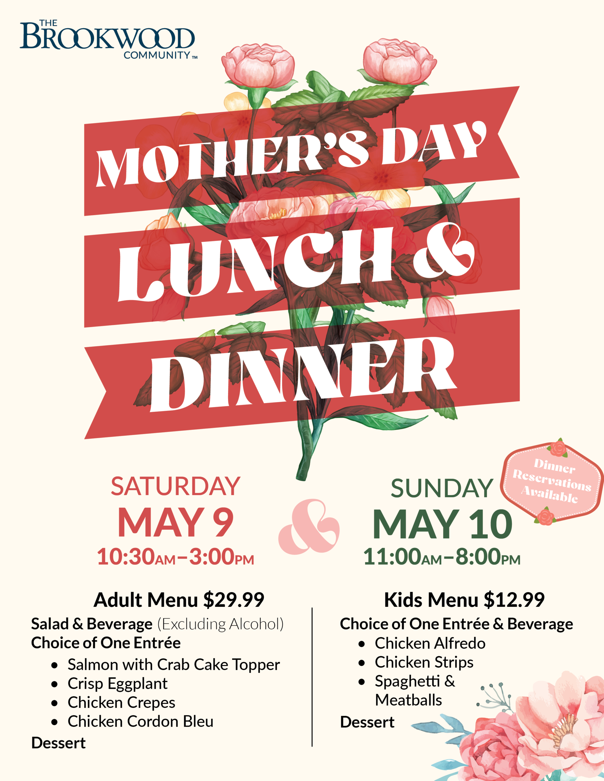 Celebrate Mother’s Day weekend at The Brookwood Community™ with a special dining experience at the Brookwood Café! Join us for a delicious Mother’s Day Special Menu available Saturday, May 10 from 10:30am–3:00pm (lunch) or Sunday, May 11 from 11:00am–8:00pm (lunch & dinner) We’re excited to offer extended dinner service on Sunday, making it the perfect opportunity to treat Mom to a relaxing and memorable meal.
